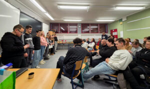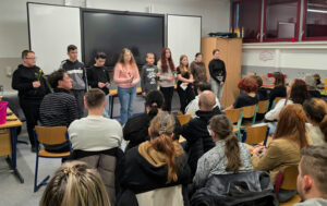 Wir haben uns gemeinsam getroffen, und haben Kameraeinstellungen o.ä. gelernt. Als nächstes ging es weiter mit der Abstimmung. Wir haben alle demokratisch abgestimmt und uns für das Thema „Mobbing“ entschieden. Als nächstes wurde laaaange das Drehbuch geschrieben: Text & Regieanweisung. Die Regieanweisung ist ein Text, der im Drehbuch steht für bestimmte Bewegungen, Emotionen etc.